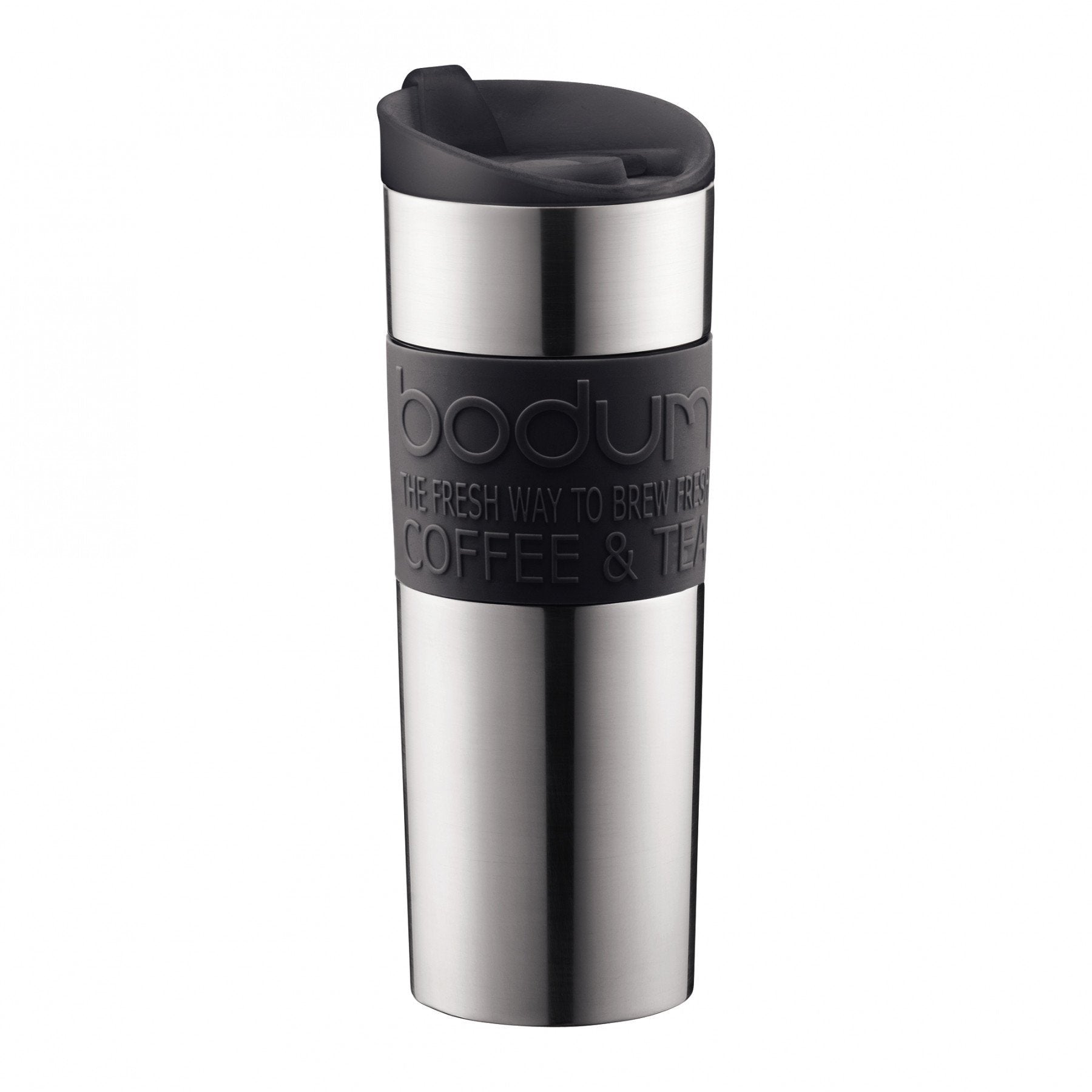 This 15 oz. Bodum travel mug (in silver) is both vacuum sealed and made from stainless steel for maximum heat retention. The black silicon non-slip grip will protect your hands from the heat and provide comfort while sipping.